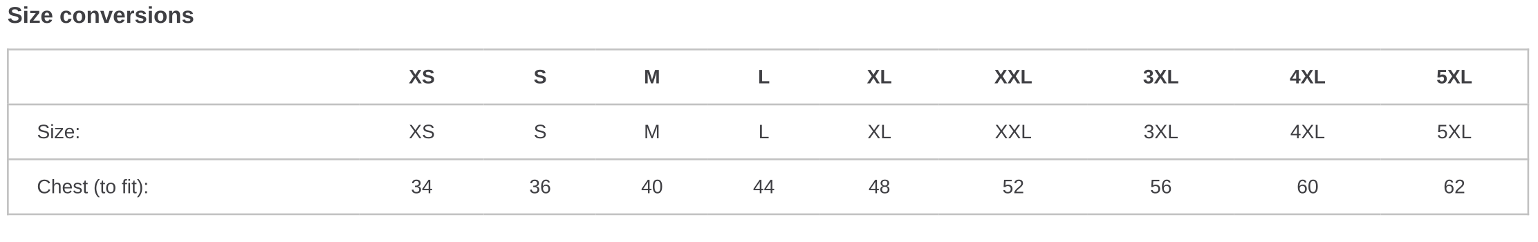 Chest (to fit) 34 36 40 44 48 52 56 60 62